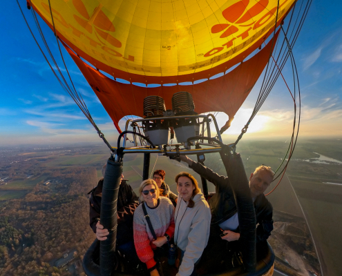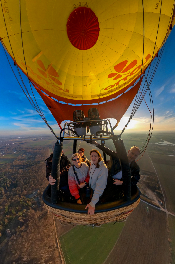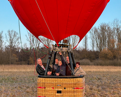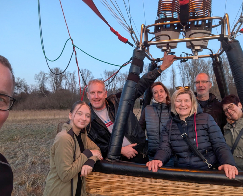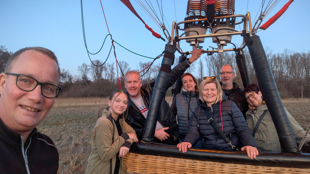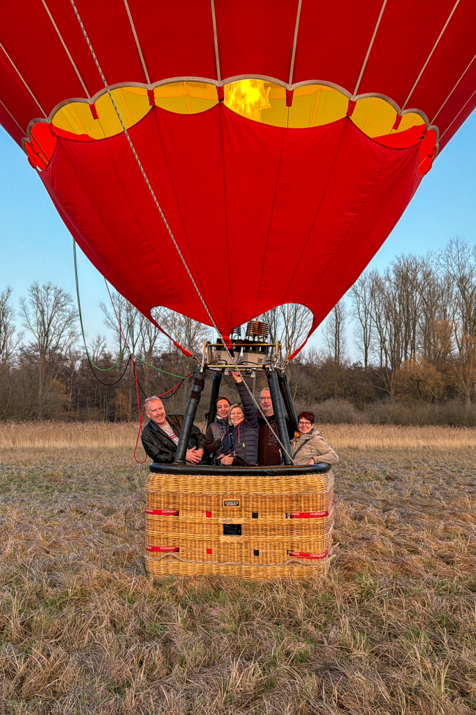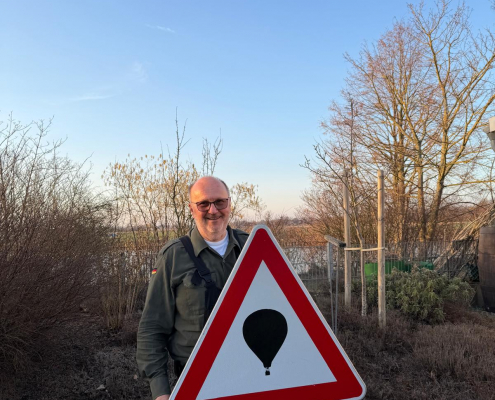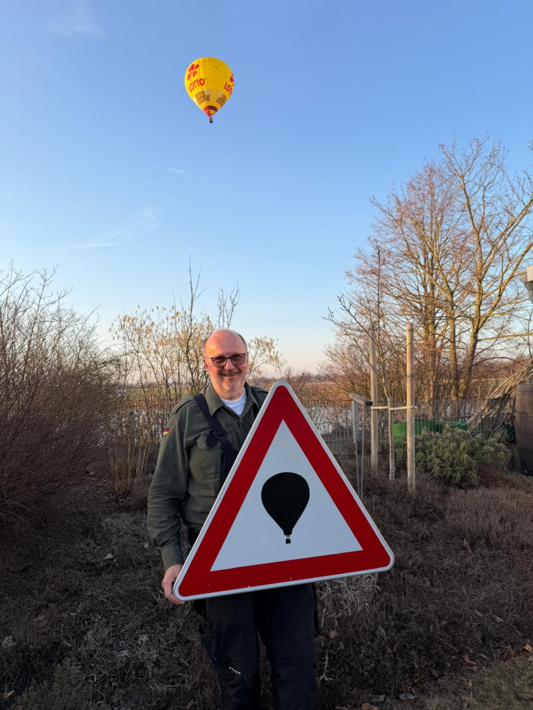 Das prächtige Wetter schreit nach einer Ballonfahrt! Der Bodenwind weht Richtung Westen, der Höhenwind dreht auf Nordwest. Das schreit nach einer Zielanfahrt vom Festplatz Lehndorf zur Marina Bortfeld. Der Ballonfahrerkollege Andy wartet schon mit einem passenden Verkehrszeichen